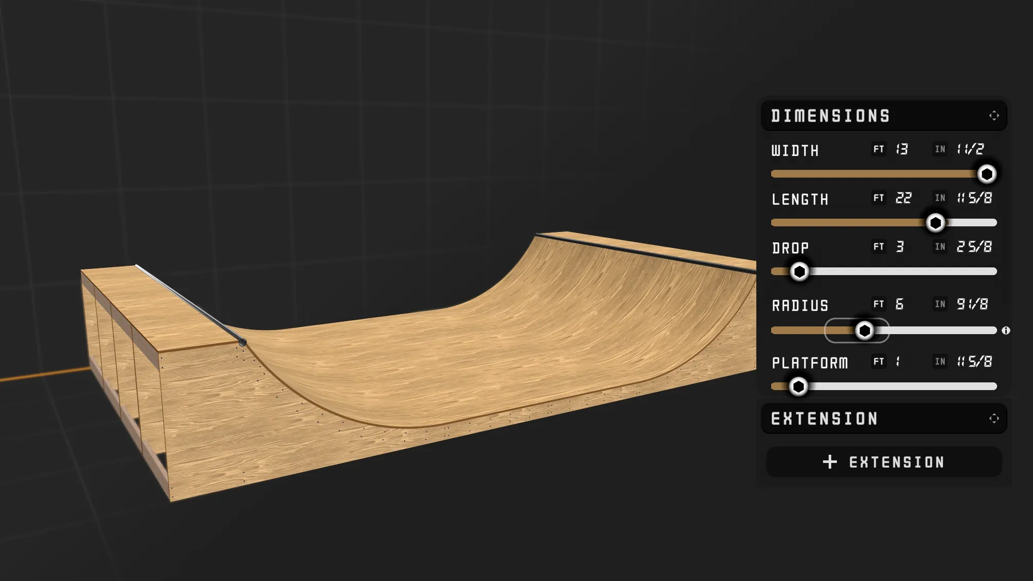 Balanced radius, flat-bottom, drop, and coping reveal update in real time as you adjust the ramp.